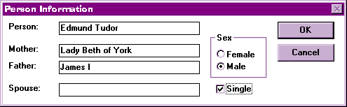 add_person(�Edmund Tudor�, male, �Lady Beth of York�, �James I�, single)