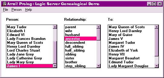 If the query succeeds, we fill in the person and relations list boxes, otherwise we ask Prolog what the error was, and display it for the user.