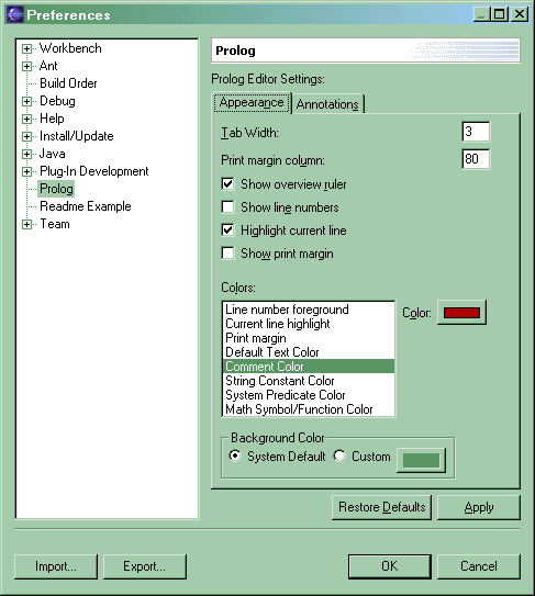 The Prolog Editor preferences are: