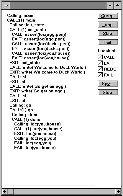Calling: main CALL:(1) main ? c CALL: consult(duckenv) ? c EXIT: consult(duckenv) Calling: write(Welcome to Duck World) CALL: write( Welcome to Duck World ) ? c Welcome to Duck World EXIT: write( Welcome to Duck World )